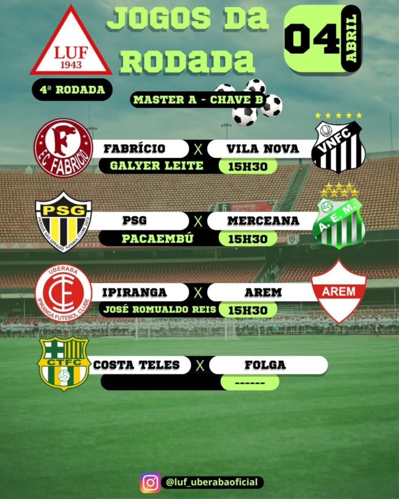 No sábado dia 4 de abril, durante o período da tarde, o Campeonato de Futebol Master Módulo A de Uberaba assume o protagonismo com a realização da segunda rodada da Chave A e da quarta rodada da Chave B, reunindo atletas experientes e promovendo confrontos equilibrados, como o duelo entre Bom Retiro e Sete Colinas, programado para o Estádio Ismael de Oliveira, reforçando a competitividade da categoria veterana.