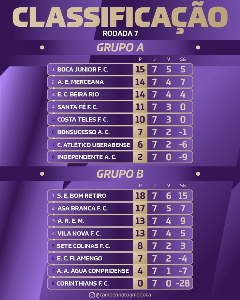Confira a classificação final e as equipes classificadas, após a sétima e última rodada da Fase de Classificação do Amadorão Módulo A, feita pelo Instagram campeonatoa amador.a: