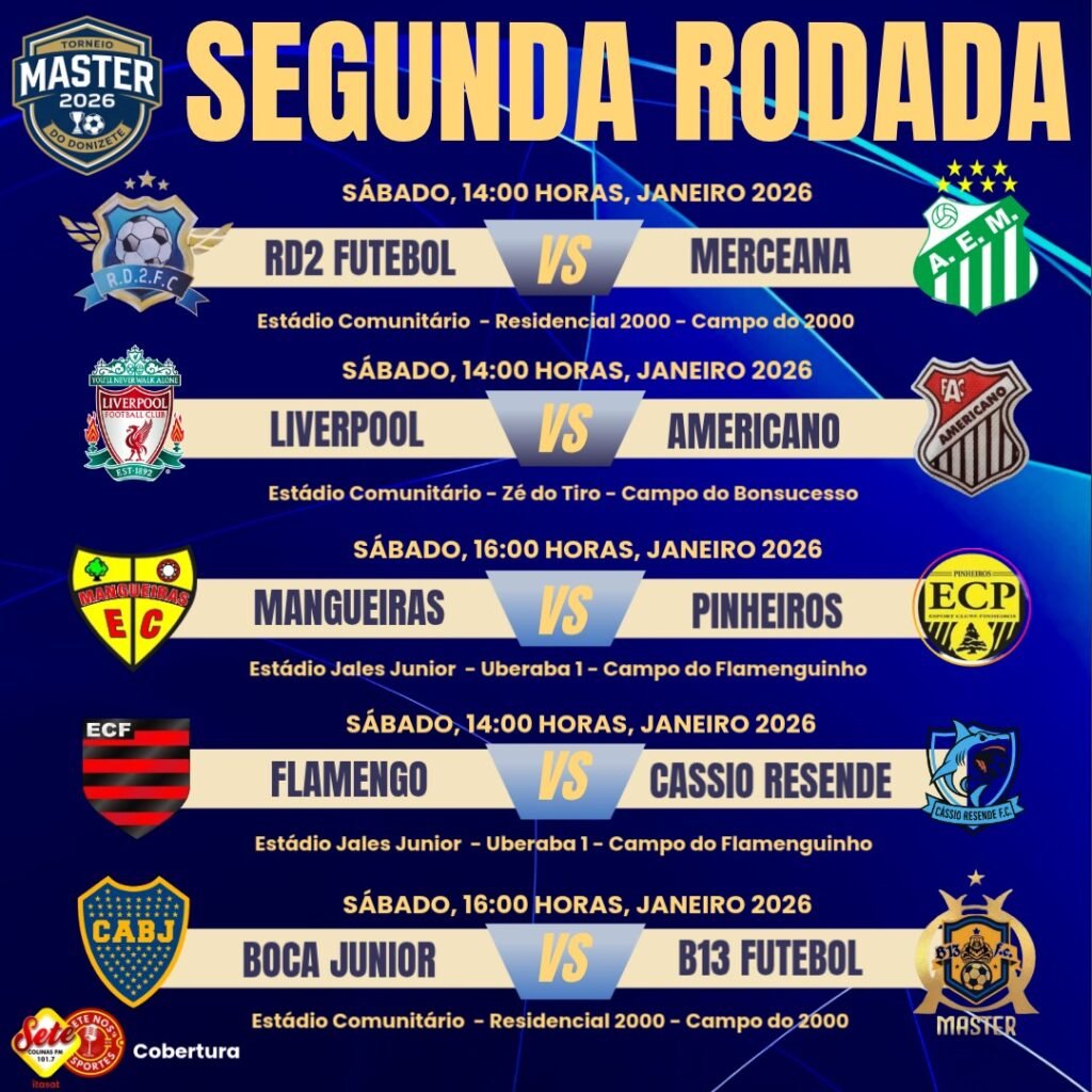 O Campeonato de Master 2026 do Donizete terá sequência na tarde deste sábado dia 10 de janeiro com a realização de mais 5 partidas. Confira os jogos: