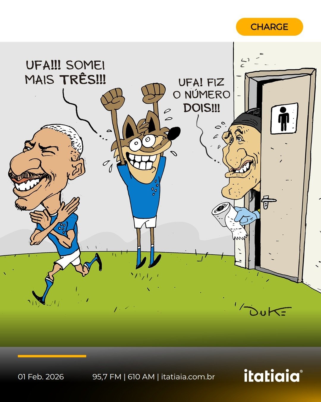 O chargista Duke, da Itatiaia Esporte, voltou a agitar o noticiário esportivo ao usar o humor como lente, pois, novamente, traduziu um momento curioso do futebol em charge viral. Desta vez, portanto, o alvo foi o goleiro Cássio, do Cruzeiro, que protagonizou uma cena inesperada no jogo da noite de domingo, 1º de fevereiro, contra o Betim, quando precisou interromper a partida por causa de um “piriri”.