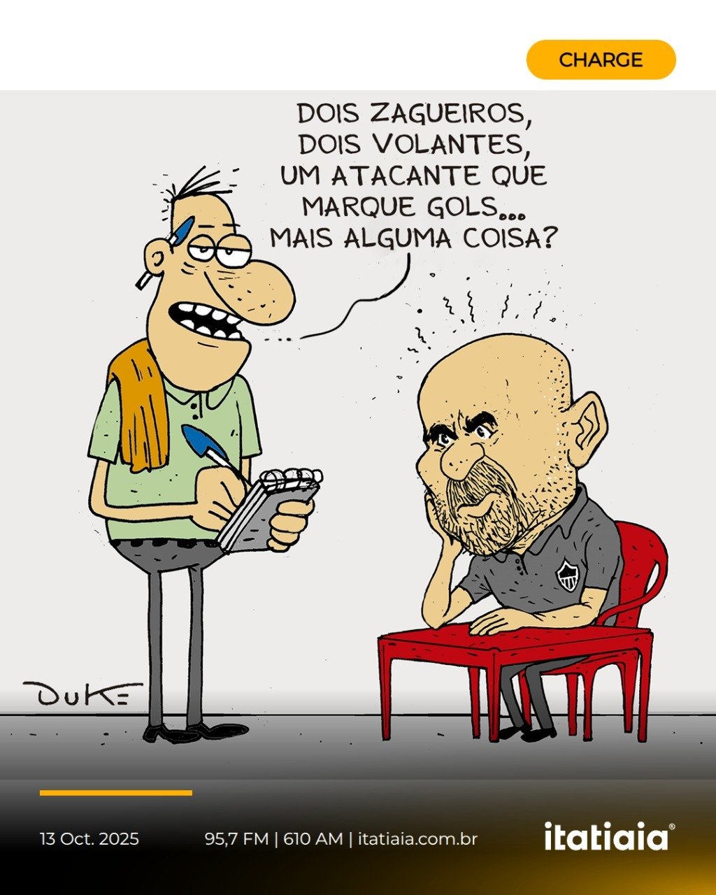 Chargista da Itatiaia, Duke abordou, nesta segunda-feira (13), a dificuldade do técnico Jorge Sampaoli para montar a equipe que enfrentará o Cruzeiro.