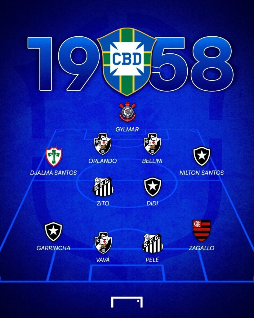 Em 1958, na Suécia, o Brasil encantou o mundo com Pelé, Garrincha e Didi. Os titulares vinham, principalmente, de clubes tradicionais como Botafogo, Santos, Flamengo, Vasco da Gama e Portuguesa. Essa mistura de talentos fez nascer o futebol-arte que marcaria a história do país.