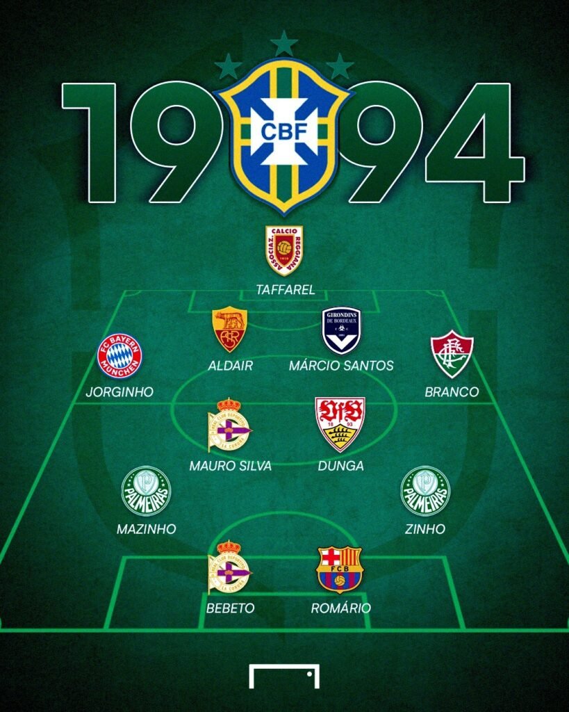 Em 1994, nos Estados Unidos, o tetracampeonato teve um elenco mais pragmático, com base em atletas que atuavam na Europa. Romário, destaque do torneio, jogava pelo Barcelona, enquanto Dunga estava no Stuttgart, com Mazinho e Zinho representando o Palmeiras. O time misturou experiência internacional com a força dos clubes brasileiros.