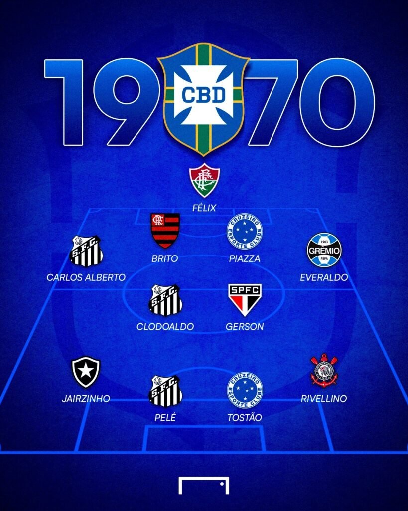A conquista de 1970, no México, levou o futebol brasileiro ao auge. A equipe liderada por Pelé, Tostão, Jairzinho, Rivelino e Carlos Alberto Torres reunia nomes de Santos, Botafogo, Cruzeiro, Corinthians, Flamengo e Fluminense. Esse time ficou eternizado por unir talento, disciplina e espetáculo em campo.