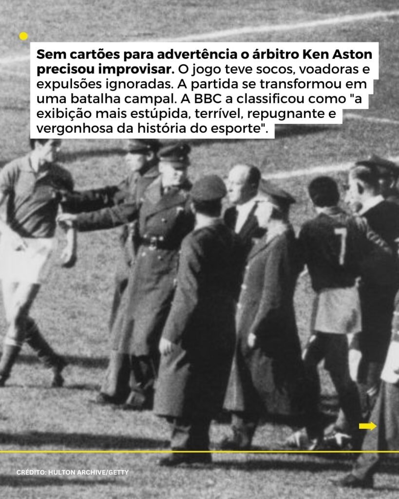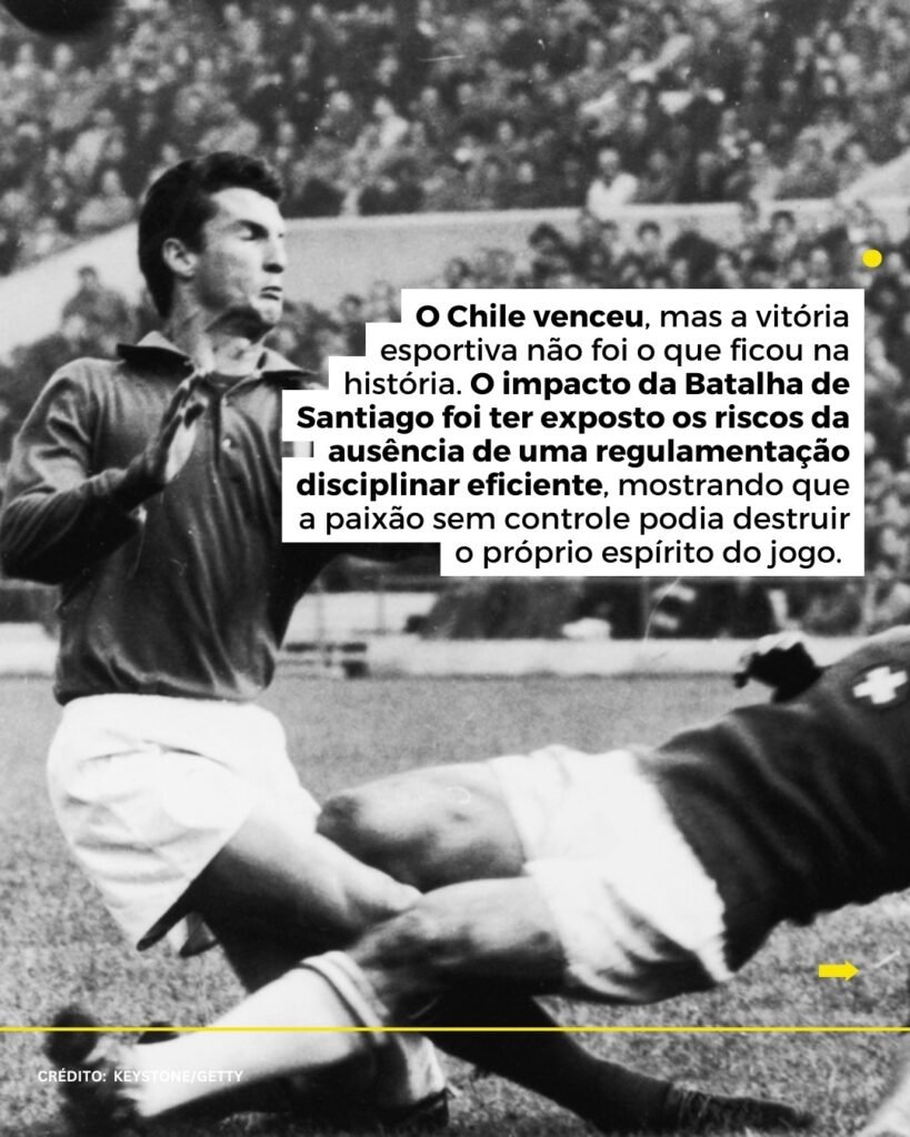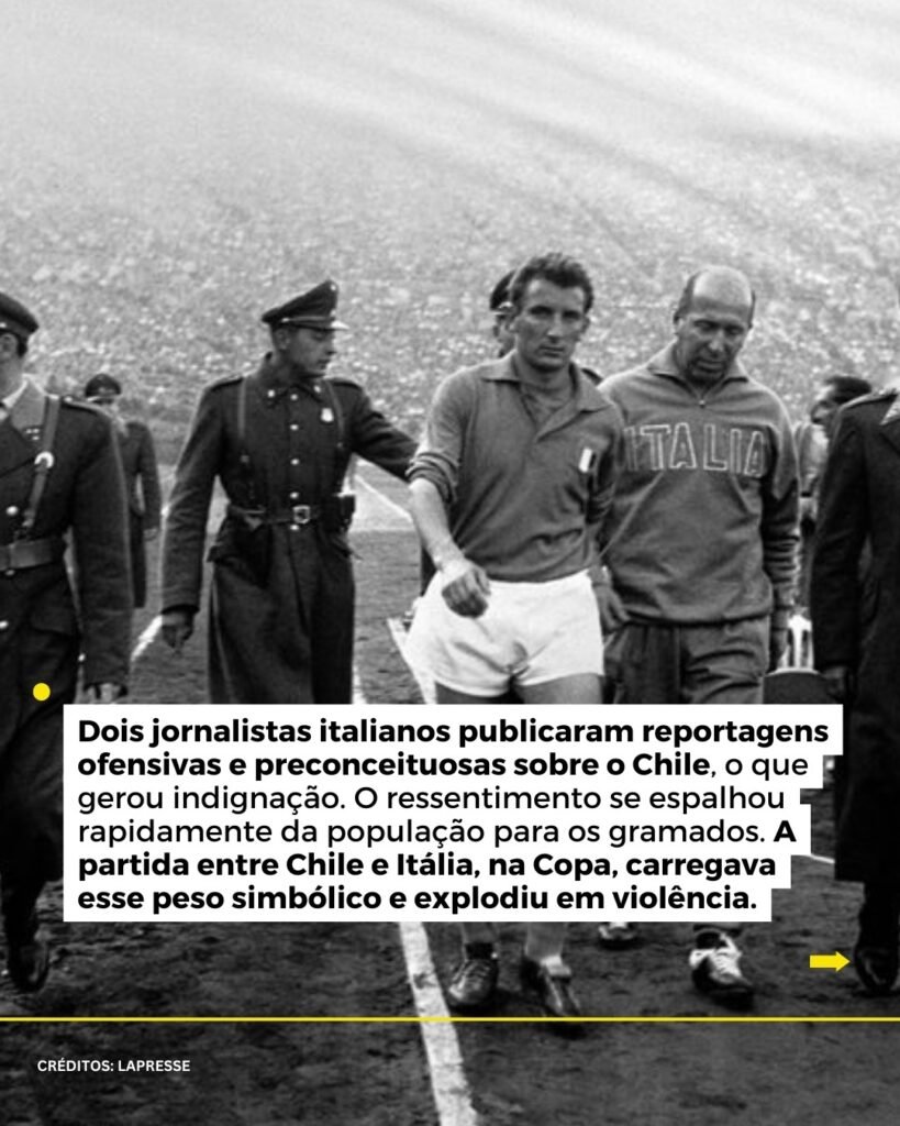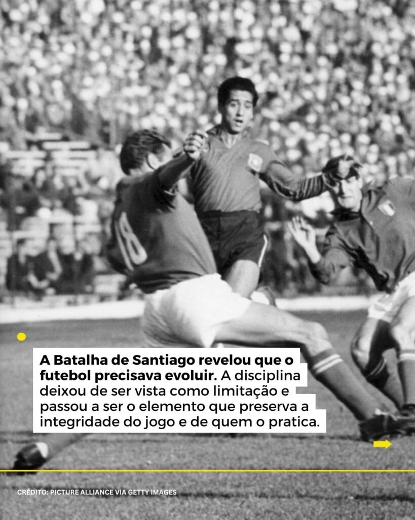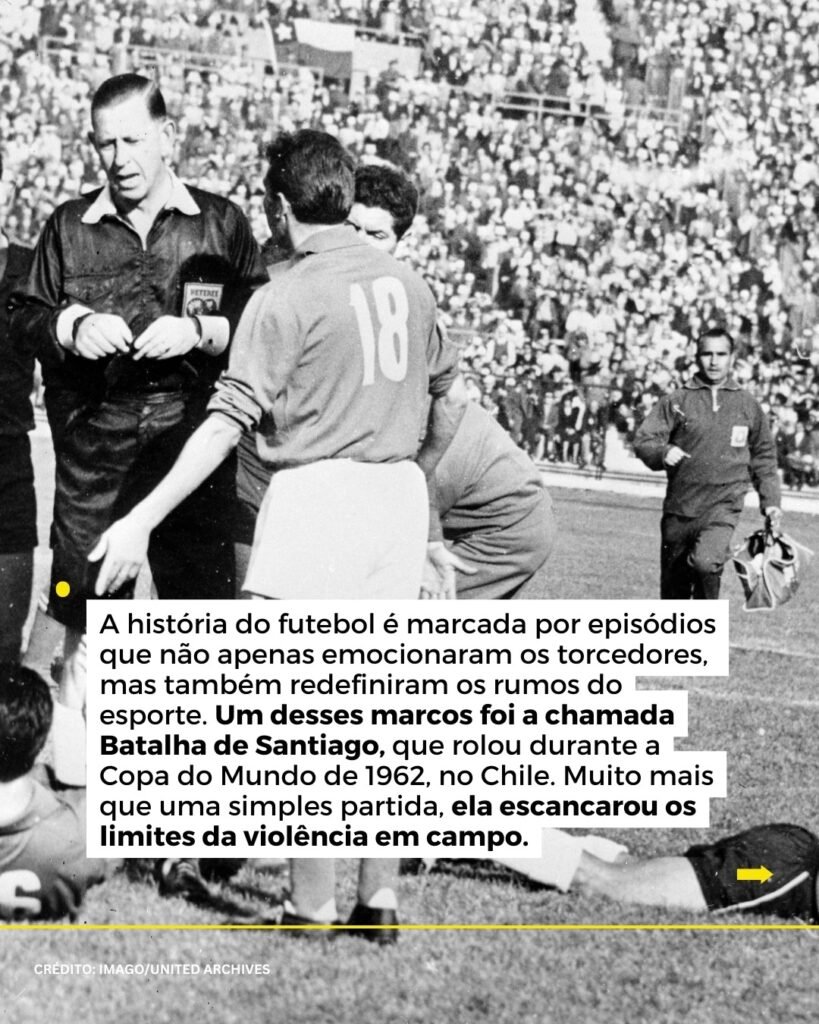 Confira nas fotos abaixo, com créditos de Imago/United archives, a história, postada na página do Instagram do peleja, a Batalha de Santiago que ocorreu durante a Copa do Mundo de 1962 realfizada no Chile.
