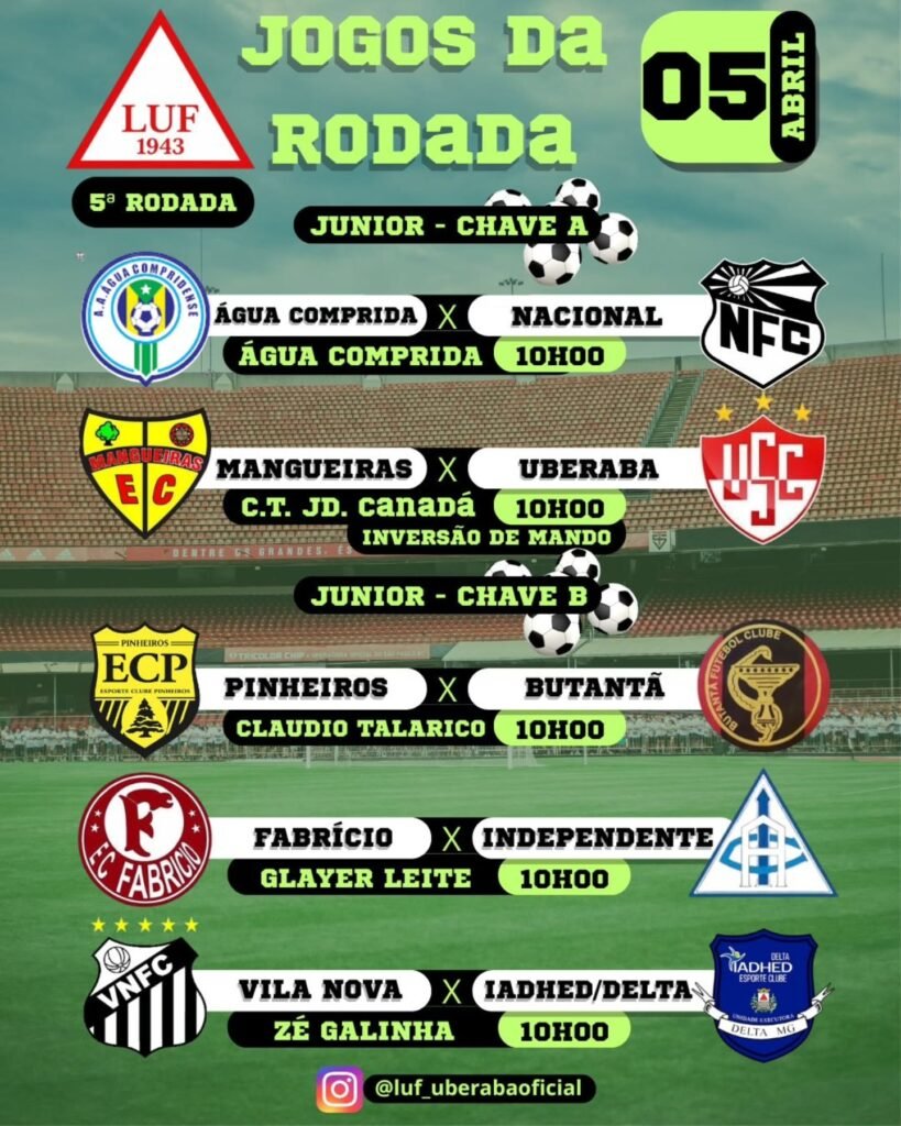 Em seguida, ainda pela manhã, ocorre a quinta rodada do Campeonato de Futebol Júnior de Uberaba, com cinco confrontos distribuídos entre as duas chaves, sequência que mantém alto o ritmo competitivo na competição.