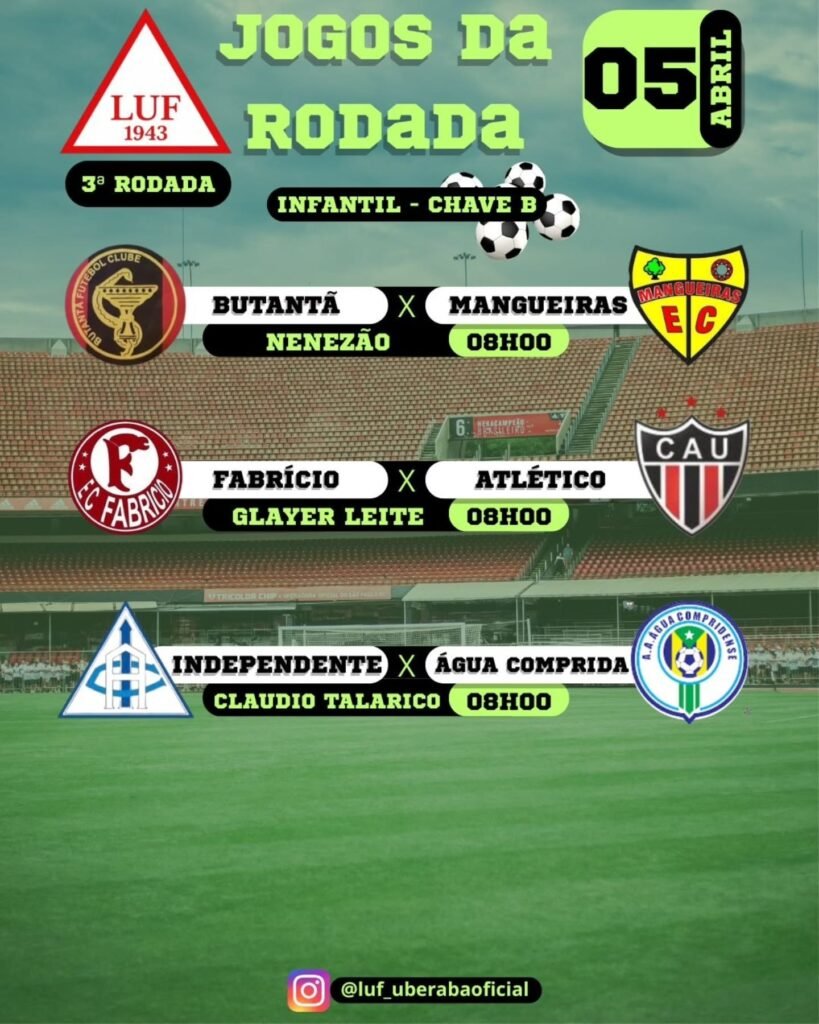 Já no domingo dia 5, a programação começa pela manhã com a terceira rodada do Campeonato de Futebol Infantil de Uberaba, que contará com seis partidas divididas igualmente entre as Chaves A e B, ampliando o espaço para jovens talentos e consolidando o processo de formação de atletas.