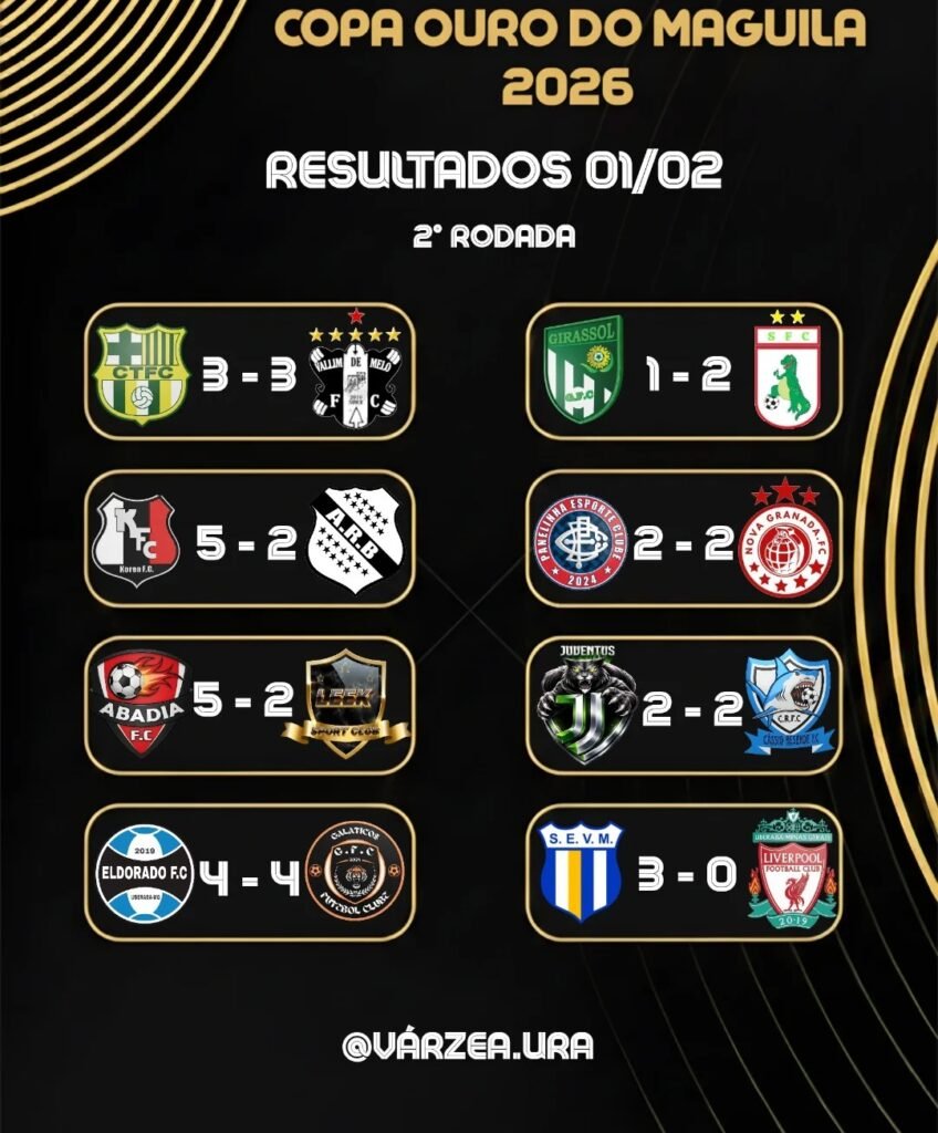 A segunda rodada da Copa Ouro do Maguila 2026 foi encerrada na tarde deste domingo dia 1º de fevereiro, em clima de festa e, acima de tudo, de futebol ofensivo, já que os gramados viram um espetáculo raro no cenário do futebol varzeano. Ao todo, 81 gols foram marcados, número que, reforça o crescimento técnico da competição e, ao mesmo tempo, aumenta o interesse do público esportivo que acompanha cada detalhe do torneio. Desde os primeiros jogos, as equipes adotaram uma postura agressiva, buscaram o ataque constantemente e transformaram cada partida em um duelo intenso do início ao fim.