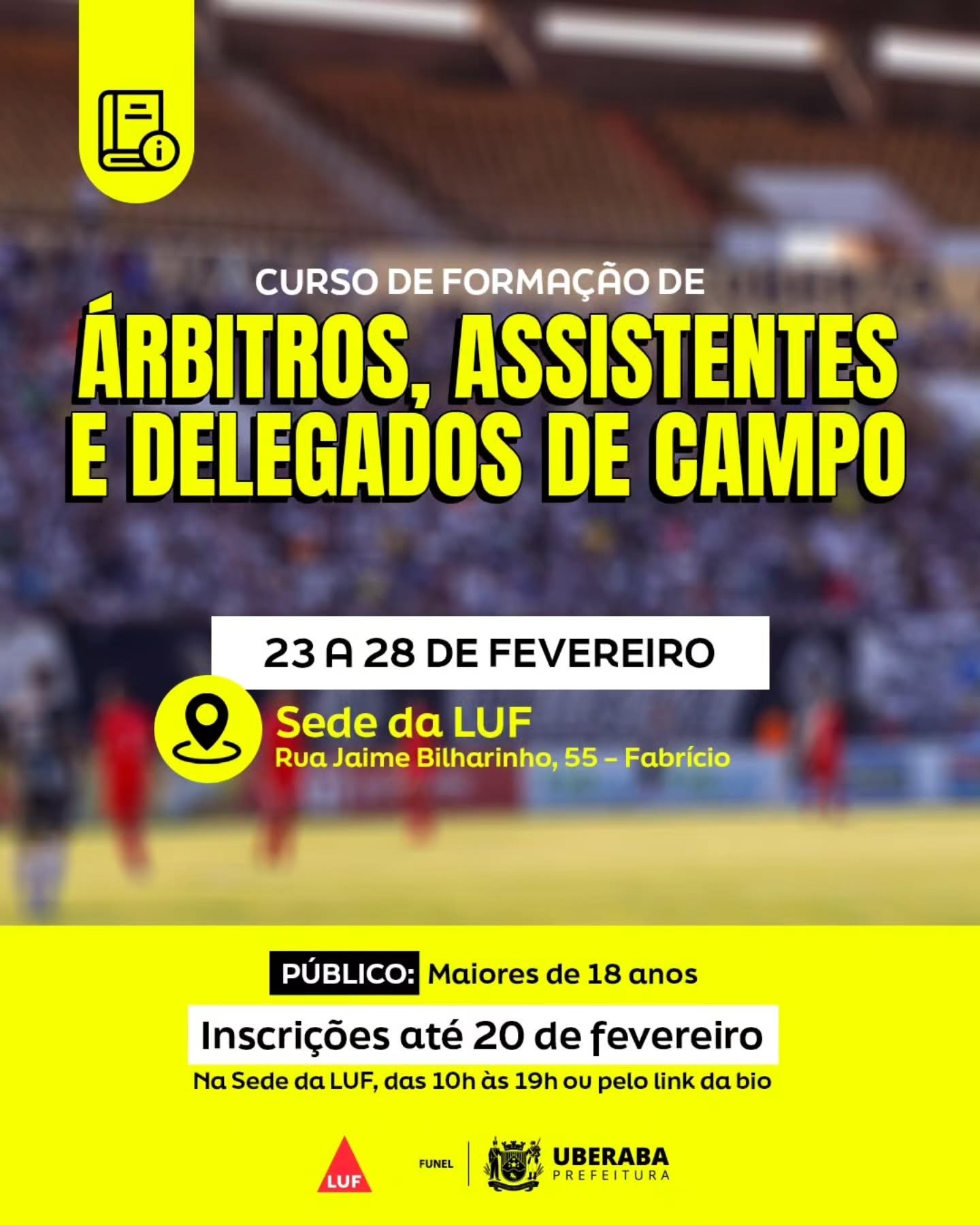 A Fundação Municipal de Esporte e Lazer – Funel Uberaba, em parceria com a Liga Uberabense de Futebol – LUF, iniciou as inscrições para o Curso de Formação de Árbitros, Assistentes e Delegados de Campo, iniciativa que, promete fortalecer ainda mais o futebol amador e competitivo de Uberaba e cidades vizinhas. O Curso terá início no dia 23 de fevereiro se extendendo até o dia 28 e, o prazo para inscrições segue até 20 de fevereiro, o curso é totalmente gratuito e conta com 40 horas de capacitação, unindo teoria e prática para preparar novos profissionais da arbitragem.