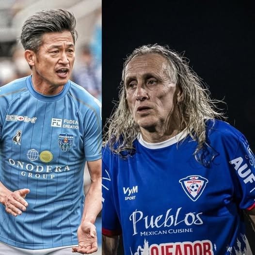 O Japonês Kazuyoshi Miura, de 58 anos que atualmente atua pelo Atletico Suzuka Club e o uruguaio Robert Camona de 64 anos, atualmente sem clube, são os dois jogadores de futebol ainda em atividade – Fotos: Divulgação