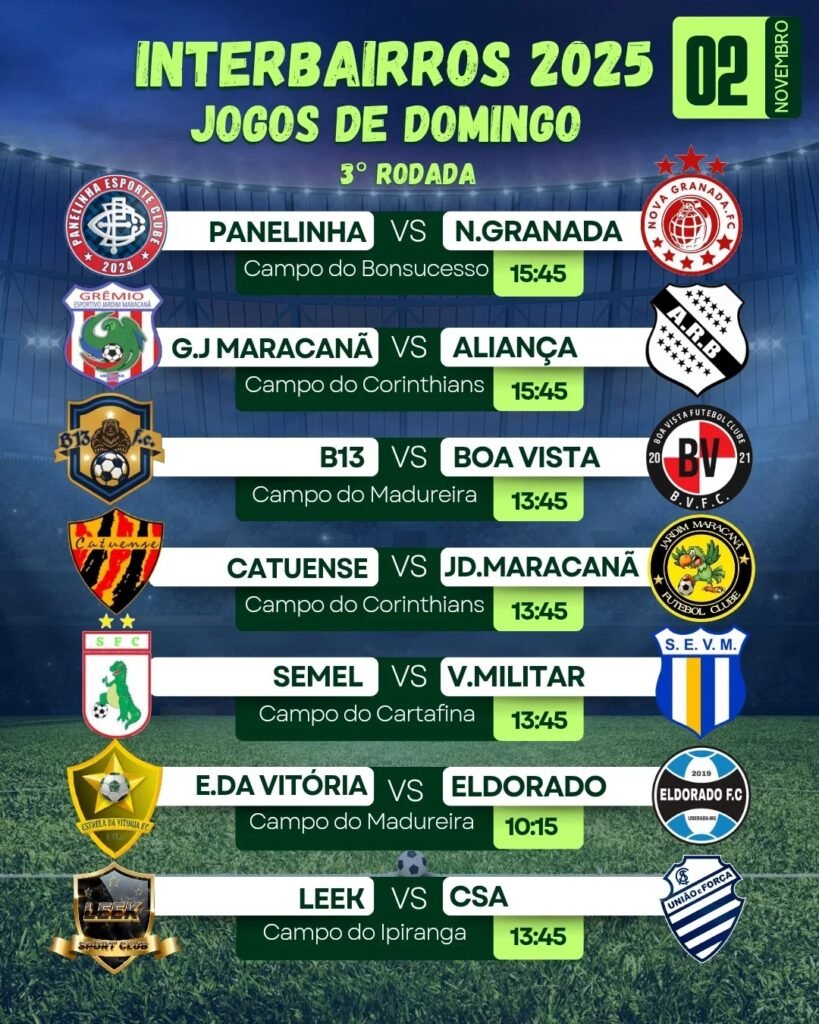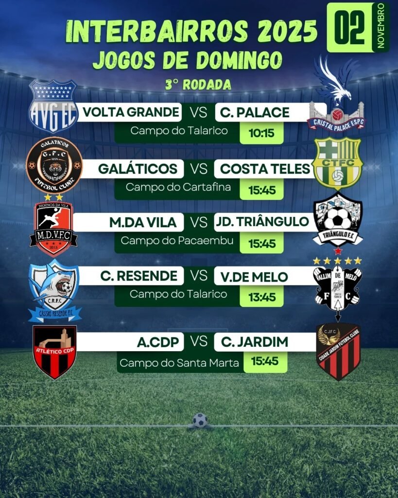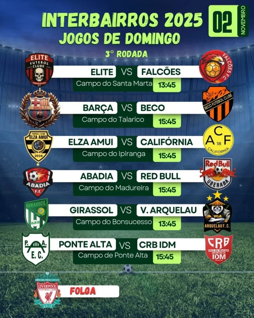 A Fundação de Esporte e Lazer Uberaba – Funel, juntamente com a Liga Uberabense de Futebol – LUF, promovem na tarde deste domingo, 2 de novembro, a 3ª rodada do Campeonato de Futebol Interbairros Varzeano de Uberaba.