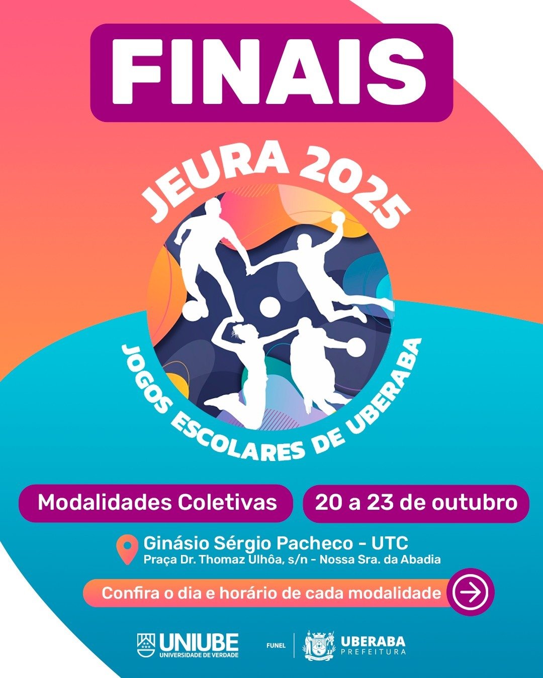 Uberaba vai viver dias intensos de disputa e emoção com as finais das modalidades coletivas dos Jogos Estudantis de Uberaba (Jeura) 2025, promovidos pela Fundação Municipal de Esporte e Lazer (Funel), em parceria com a Universidade de Uberaba (Uniube). As decisões acontecem de 20 a 23 de outubro, no Ginásio Sérgio Pacheco (UTC), reunindo os melhores times das escolas públicas e particulares da cidade.