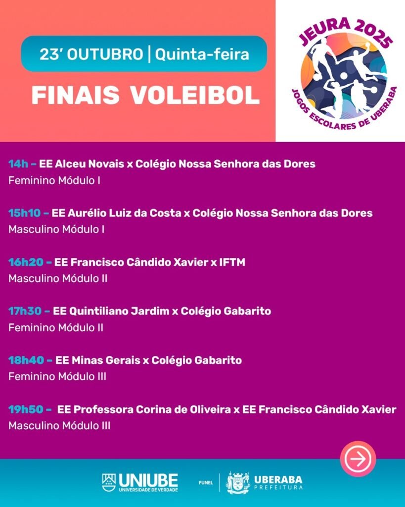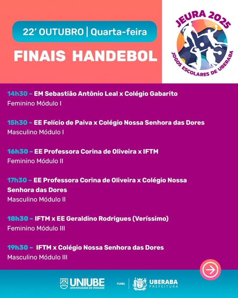 O handebol entra em quadra na quarta-feira (22), com grandes clássicos entre escolas tradicionais. A E.M. Sebastião Antônio Leal, Colégio Gabarito, E.E. Felício de Paiva, E.E. Corina de Oliveira, IFTM e E.E. Geraldino Rodrigues (de Veríssimo) garantem partidas cheias de garra e técnica. Encerrando a programação, o voleibol define seus campeões na quinta-feira (23), com confrontos entre E.E. Alceu Novais, Colégio Nossa Senhora das Dores, E.E. Aurélio Luiz da Costa, E.E. Francisco Cândido Xavier, IFTM, E.E. Quintiliano Jardim, E.E. Minas Gerais e Colégio Gabarito. Serão seis jogos para fechar as finais coletivas do Jeura 2025.