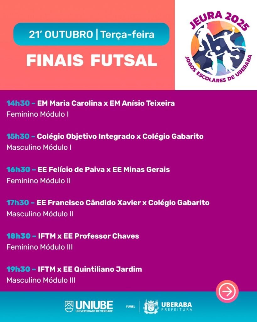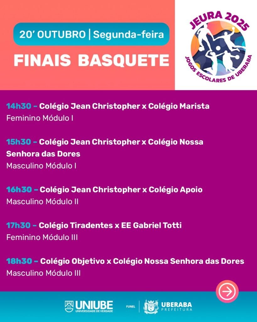 As emoções começam na segunda-feira (20) com as decisões do basquete. O Colégio Jean Christopher marca presença em três finais, enfrentando os colégios Marista, Nossa Senhora das Dores e Apoio. As demais partidas envolvem Tiradentes, Gabriel Totti, Objetivo e CNSD, encerrando o primeiro dia em ritmo de bola ao cesto. Na terça-feira (21), é a vez do futsal brilhar. As finais prometem duelos equilibrados, com escolas como E.M. Maria Carolina Mendes, Colégio Objetivo Integrado, E.E. Felício de Paiva, E.E. Minas Gerais, IFTM e E.E. Quintiliano Jardim disputando o topo em jogos que vão do Módulo I ao III.