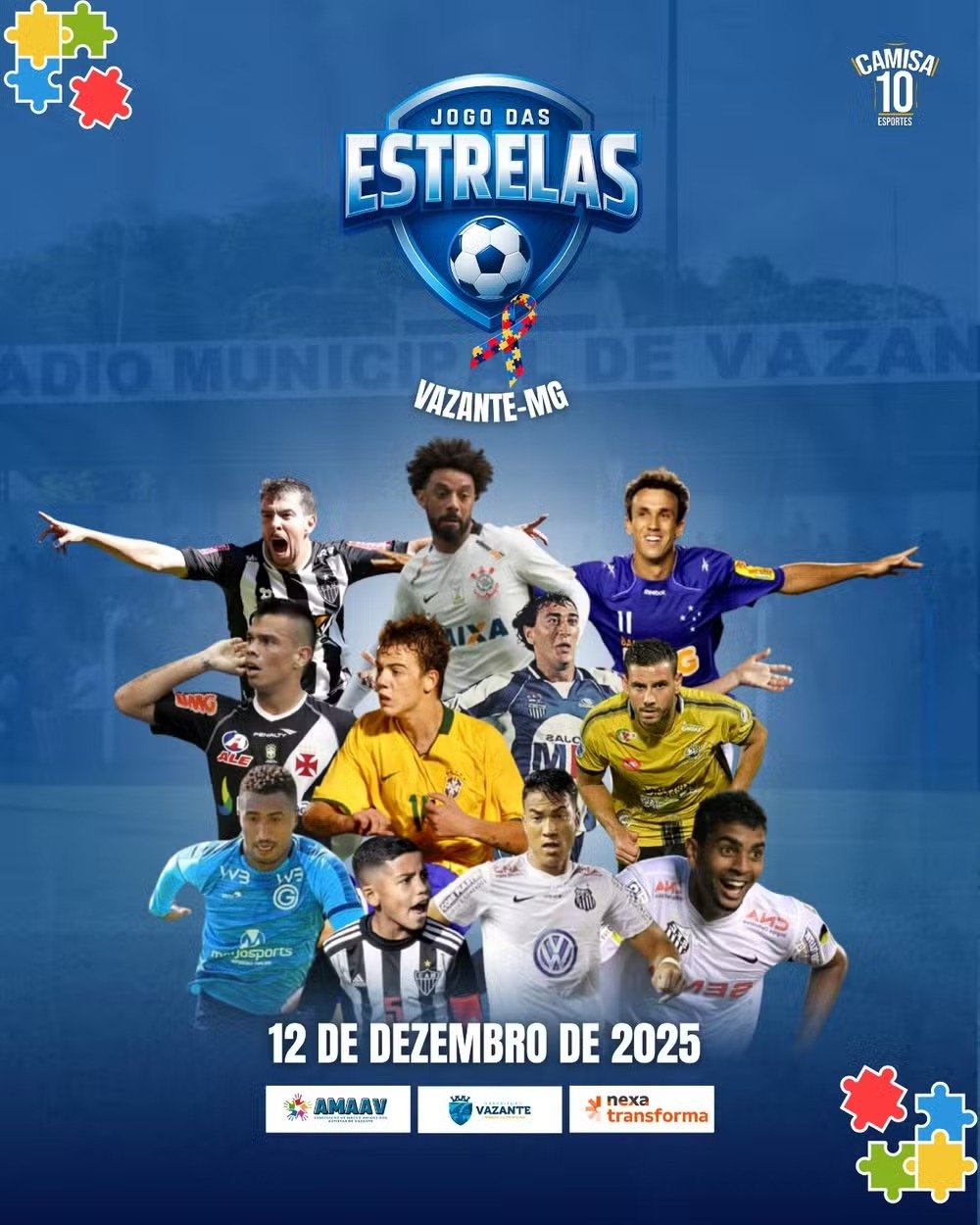 O tradicional Jogo das Estrelas promete agitar o interior de Minas Gerais em clima de festa e solidariedade. No dia 12 de dezembro, o Estádio Gigante da Colina, em Vazante, será palco de um grande encontro entre ex-craques do futebol nacional e internacional. A partida faz parte das comemorações do aniversário da cidade e terá renda totalmente revertida para a Associação de Mães e Amigos dos Autistas de Vazante (AMAAV).