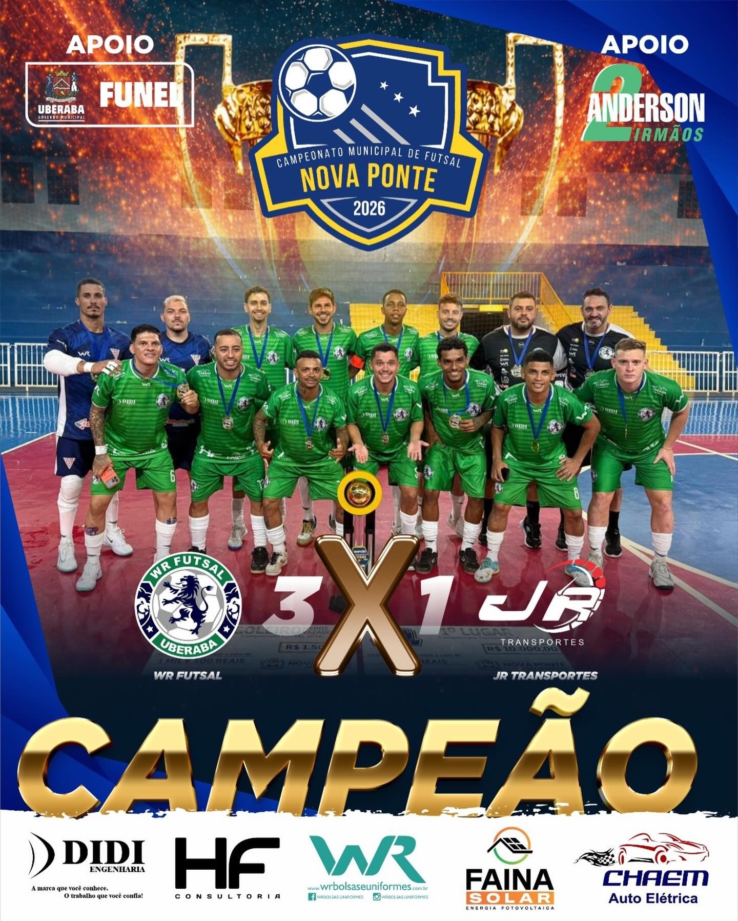 A equipe do WR Futsal/Uberaba, escreveu um capítulo marcante no futsal de Nova Ponte e Região ao conquistar, o título do Campeonato Municipal de Futsal 2026. Na grande final, realizada diante da torcida adversária, a equipe mostrou maturidade, intensidade e organização, e assim venceu o time da casa por 3 a 1, resultado que confirmou, de forma incontestável, a primeira conquista do clube na competição.