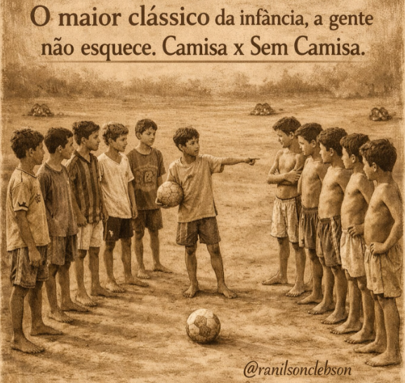 Antes de começar o jogo, vinha a decisão mais clássica da infância: camisa contra sem camisa. Não tinha árbitro, não tinha uniforme, mas tinha amizade, risada e bola rolando até o sol se esconder.