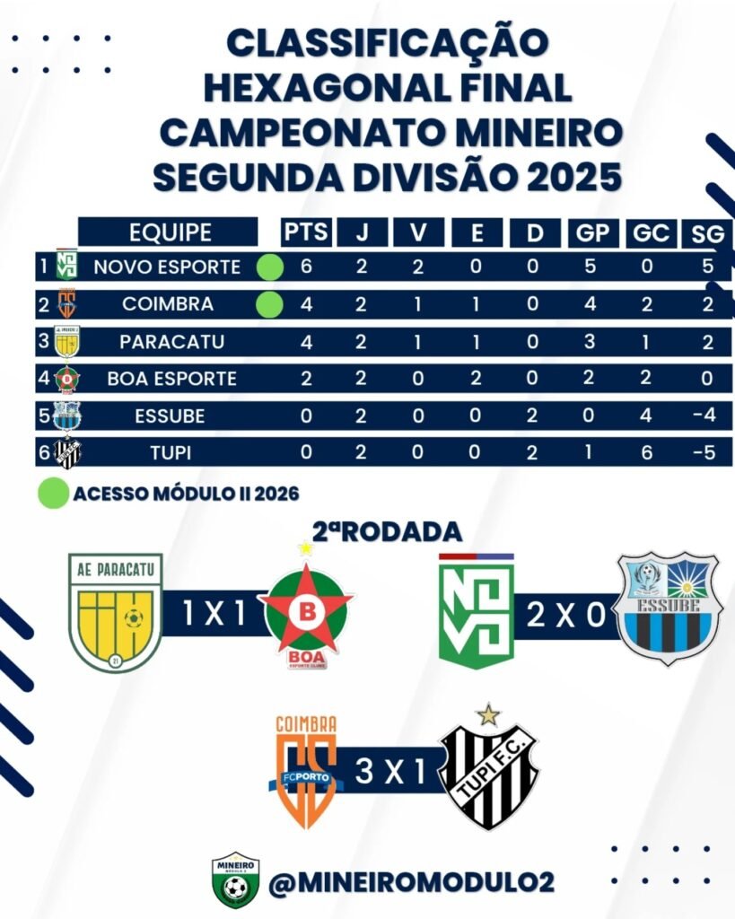 A segunda rodada do Hexagonal Final do Campeonato Mineiro da Segunda Divisão 2025, promoção da Federação Mineira de Futebol – FMF, aconteceu neste final de semana, sábado dia 1 de novembro e domingo dia 2.