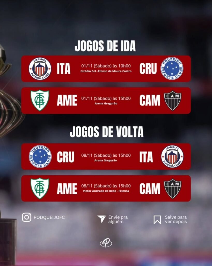 A primeira partida acontecerá entre Atlético e América, no dia 1° de novembro, sábado, às 15h (horário de Brasília). O duelo será realizado na Arena Gregorão, em Contagem, e dará início ao confronto de ida.