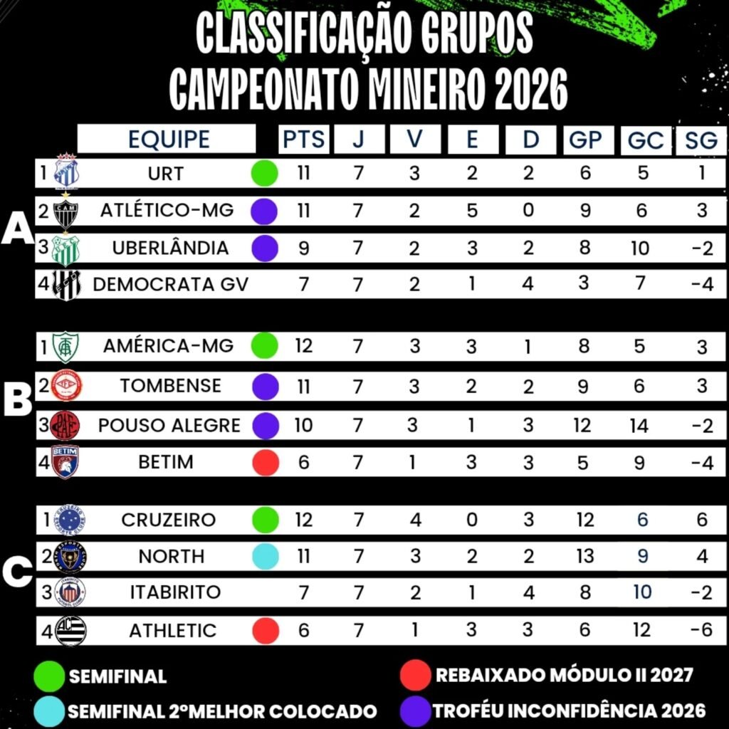 Confira abaixo Arte feita pela página mineiromodulo2 no Instagram ficou a classificação do Mineiro 2026 após a realização da sétima rodada: