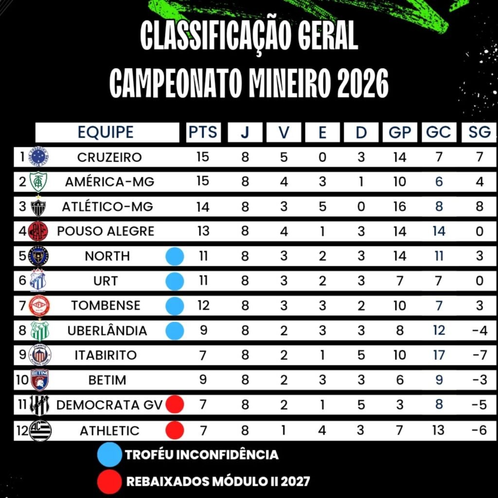 Confira na Arte abaixo, feita pela páginam mineiromodulo2 no Instagram como ficou a Classificação Geral do Campeonato Mineiro 2026: