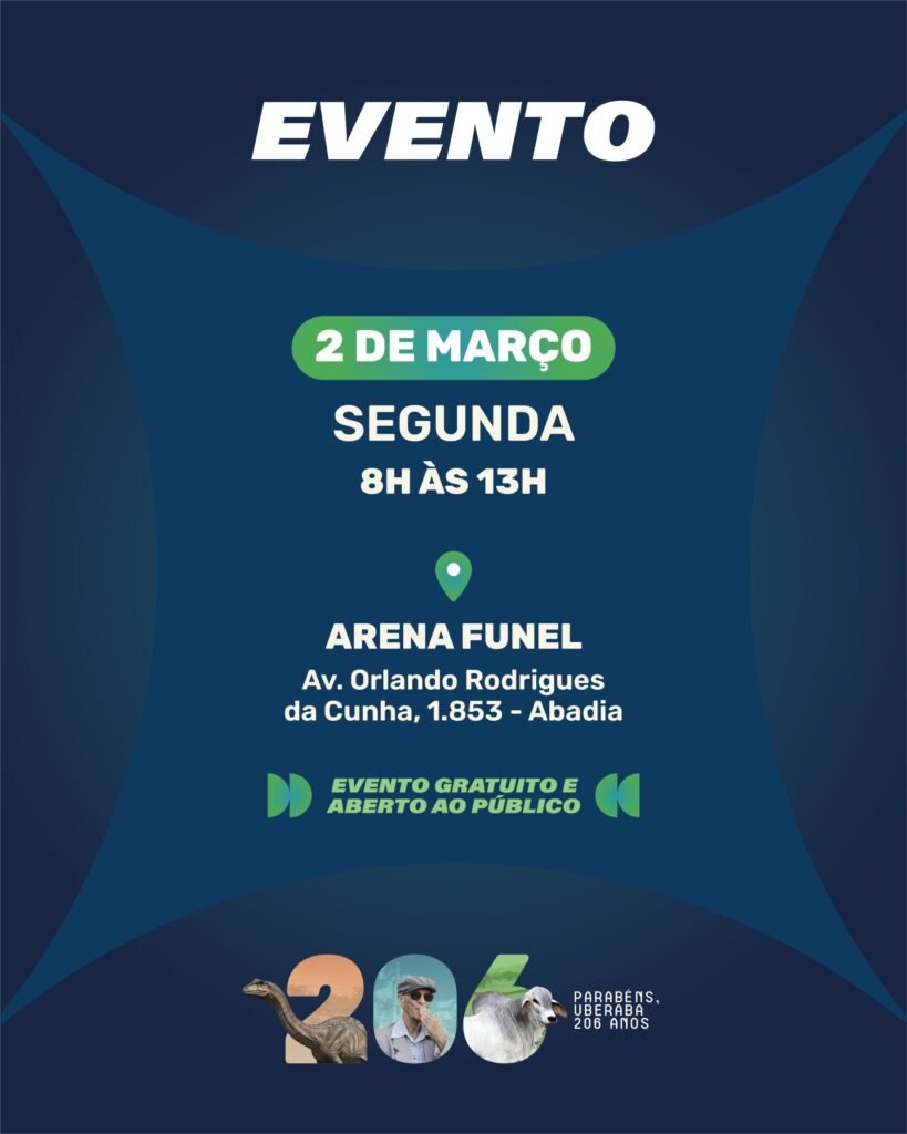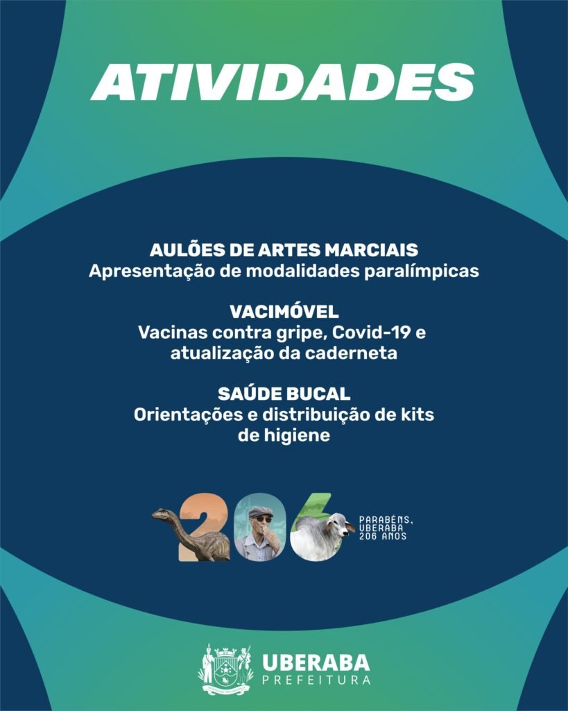 Competições esportivas, aulões abertos ao público, apresentações paradesportivas, recreação infantil, teatro, praça de alimentação com food trucks, serviços de saúde e o lançamento do Calendário Esportivo 2026 marcam a celebração dos 206 anos de Uberaba, na segunda-feira (2), das 8h às 13h, na Arena Funel.