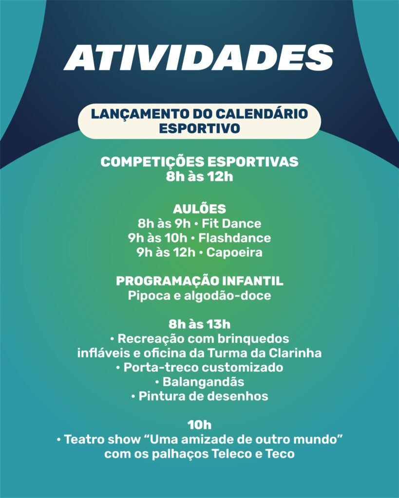 O evento marca também o lançamento do Calendário Esportivo 2026, que reúne as principais competições, projetos, eventos e ações previstos ao longo do ano. O documento consolida o planejamento esportivo do município e reforça o compromisso com a organização, a transparência e o fortalecimento das políticas públicas voltadas ao esporte e ao lazer. A inclusão também tem espaço garantido, com apresentações de Bocha, Basquete em Cadeira de Rodas e Natação.