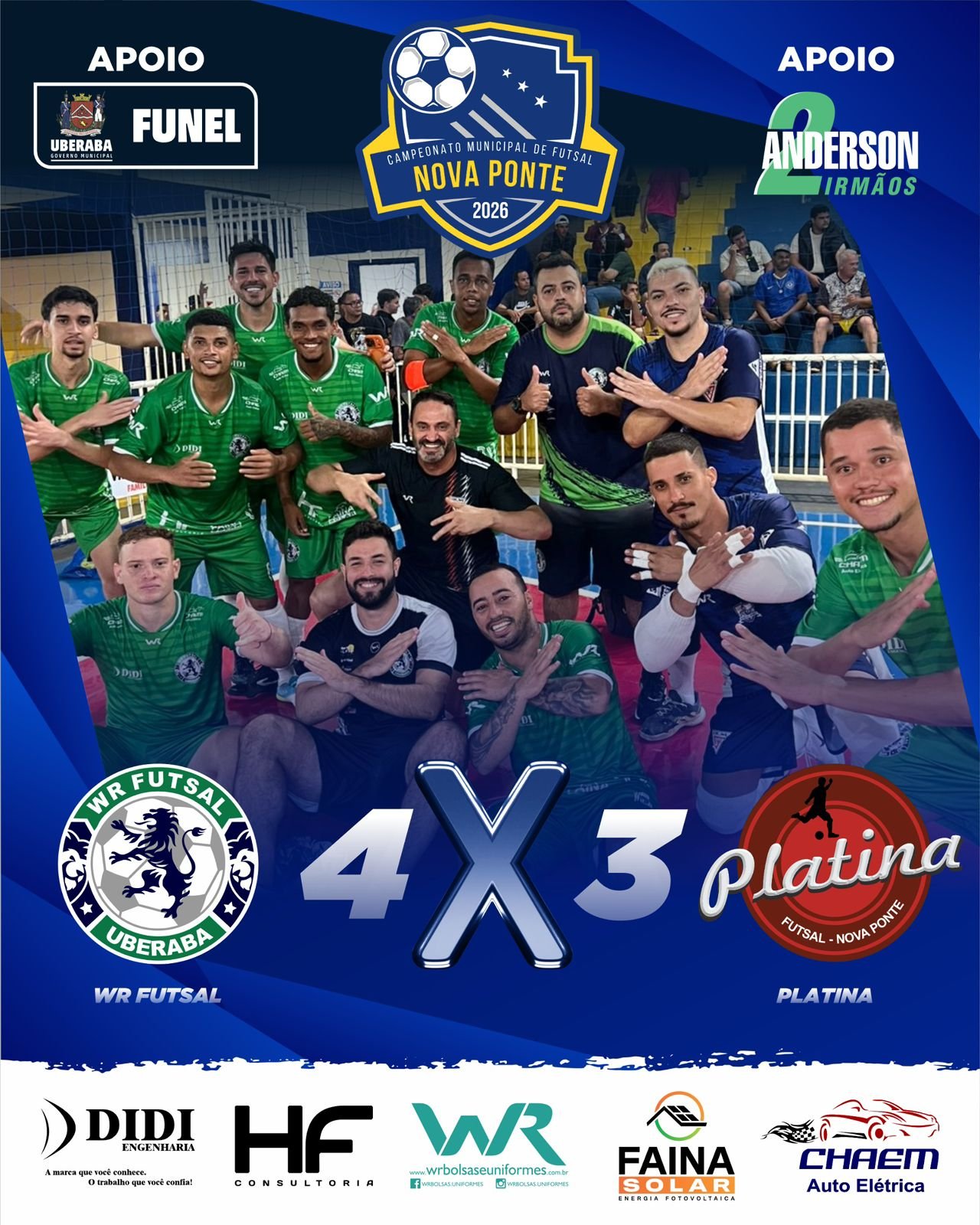 A WR Futsal/Uberaba conquistou vitória marcante diante da forte equipe da Platina Futsal ao vencer por 4 a 3, na noite desta quarta-feira, dia 28 de janeiro, em duelo válido pela semifinal do Campeonato de Futsal 2026 de Nova Ponte.